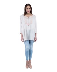 Opt for this statement top in peach color this summer season. Beat the heat in this breezy and light summer top from Alisha & Chloe. This mid-thigh length top features 3/4th sleeves and lace in the front and on shoulder. Made with good quality rayon gauze fabric, this top is super comfortable to wear.