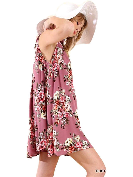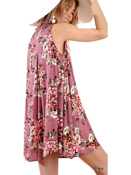 Floral Print Sleeveless Shift Keyhole Dress with Crochet and Mesh Neckline , Dusty Rose