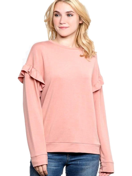 French Terry Crew Neck Pull Over With Ruffle Sleeve and Banded Hem Model is wearing small Fabric 78% Polyester 17% Rayon 5% Span