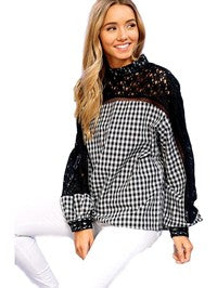Gingham woven top with lace contrast - Mandarin collar - Lace contrast - Long puff sleeves - Cuffs with button on sleeve opening - Keyhole on back - Model is 5\' 9.5\" 32-23.5-34 and wearing a size Small Fabric 100% cotton