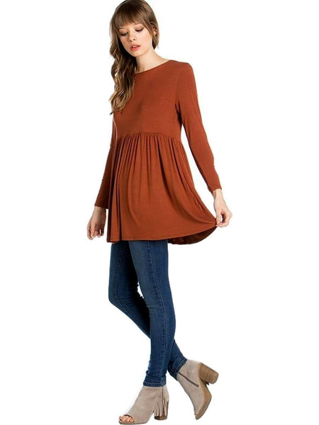 Long Sleeve Baby Doll Top Small: Bust - 36", Sleeve - 24" Length - 31" Medium: Bust - 38", Sleeve - 24.5", Length - 31.5" Large: Bust - 40", Sleeve - 25", Length - 32" Extra Large: Bust - 42", Sleeve - 25.5" Length - 32.5" Fabric 95% Rayon 5% Spandex MADE IN USA