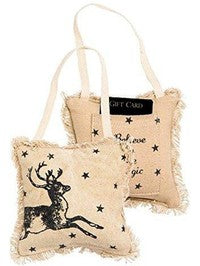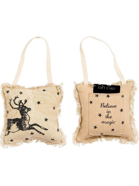 100% Cotton Imported Mini hanging holiday pillow with fringe detailing and gift card pocket on back 5-Inch square; 100% polyester fiber insert On front: reindeer design; on back: Believe in the magic Pillow comes flat for eco-shipping; remove from bag, hand fluff heartily Authentic Primitives by Kathy pillow designed in Lancaster, Pennsylvania; spot clean only