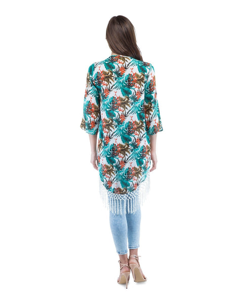 Grab the limelight and stay stylish this summer season with this beautiful kimono by Miss Innocent. This kimono features an interesting multi-color pattern. The printed rayon gauze fabric is light and comfortable to wear. Featuring 3/4th sleeves and black color fringes at bottom, this kimono can be teamed up with any smart pair of jeans and top.
