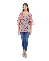 Flaunt your fashion style in this multi-color floral print summer top. Made with high quality poly georgette fabric, this coral color breezy top features bell sleeves and a V-neck. Featuring 3/4th sleeves, this top by Miss Innocent is a must have in your summer wardrobe.