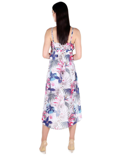 Miss Innocent bra cup high-low v-neck ivory dress with blue and pink floral pattern is a summery dress. The dress falls above the knee and has thin straps. This dress is made up of poly Ggt with poly knit lining.