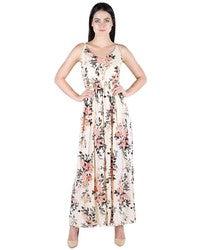 Miss Innocent ivory base and printed green and peach floral pattern strappy dress is comfortable and flowy. This maxi dress has a slight v-neck and gathers in front. This dress is made up of poly Ggt with poly knit lining.