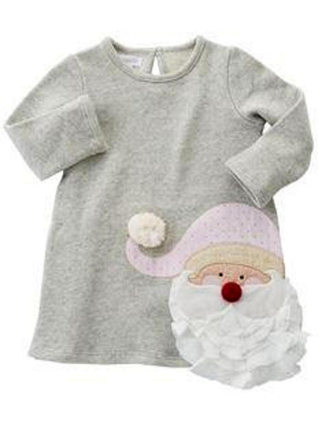 Sparkle French terry long sleeve dress features keyhole back with pearlized button closure and felt Santa applique with dimensional poly chiffon fringe beard, velvet mustache, velvet covered button nose, gold glitter dot printed jersey hat with gold linen cuff and thick ivory yarn and gold lurex threaded dimensional pom-pom hat topper.