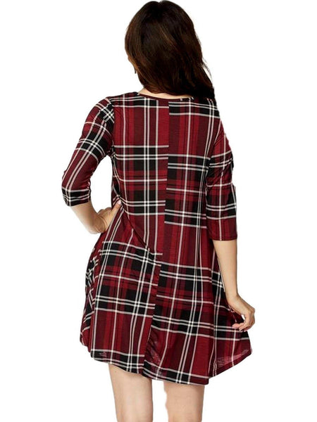 Plaid Print Dress With Criss Cross Neckline This plaid dress features a criss cross neckline, 3/4 sleeves, and pockets. Wear it with a pair of heels and you will be set for the day!