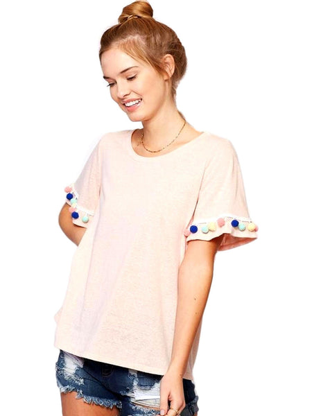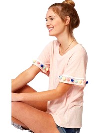 Pom pom lave trim top. Has round neck, short wide sleeves and semi-loose fit silhouette. Fabric 50% POLY 37% COTTON 13% RAYON Made in Made in USA